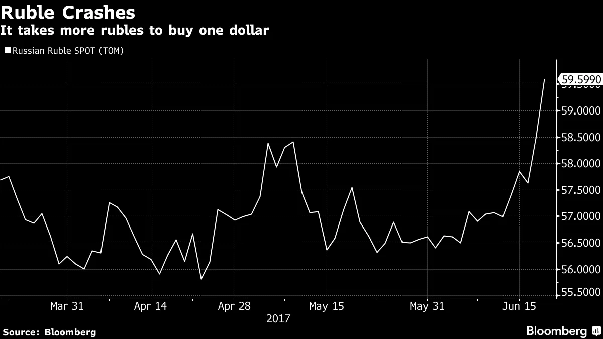 卢布正在崩溃卢布刚刚经历了自2016年2月以来最糟糕的连续两天,跌幅达到5.68%,因为油价下跌和美国制裁的扩大造成了影响。上周,俄罗斯股票进入熊市,此前美国参议院以压倒性票数投票扩大对俄罗斯的制裁。在周日击落一架叙利亚政府飞机后,俄罗斯威胁将美国战机视为目标进行回应。“卢布正面临完美风暴,”伦敦野村国际的交易员德米特里·彼得罗夫告诉彭博新闻的克谢尼亚·加卢奇科。“地缘政治紧张局势的回归和美国制裁的加强,加剧了因油价下跌而导致的早期疲软。”到2026年5月到期的俄罗斯欧元债券下跌,使收益率上升了9个基点,达到4.16%,为4月以来的最高水平。至少俄罗斯消费者是高兴的。联邦统计局周二表示,零售销售和实际工资超出预期,失业率降至八个月来的最低水平,显示出在经历近两年的收缩后,经济正在努力恢复活力。