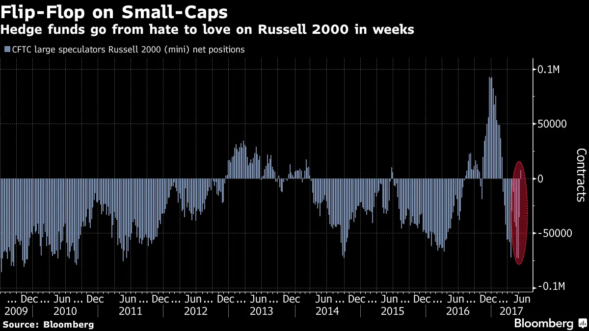 小型股再次美丽美国股市的剧烈轮动使专业投资者重新回到了小型股。仅在两周内,对罗素2000指数迷你期货的对冲基金持仓从六年来最悲观转变为四个月以来最乐观,根据彭博新闻的卢·王的报道。这是根据彭博编制的商品期货交易委员会数据记录的最大反转,数据追溯至1994年。虽然这种反转的原因难以确定,但它反映了美国股票的更大重新配置,导致银行股在过去九天中的七天上涨,并提升了特朗普当选后上涨的其他行业。金融公司主导着小型股市场,占罗素2000指数的近三分之一,几乎是标准普尔500指数的两倍。另一个驱动因素是信用利差的缩小,这表明金融宽松的迹象,对杠杆接近历史高位的小型公司来说是个好兆头,根据美国银行的说法。