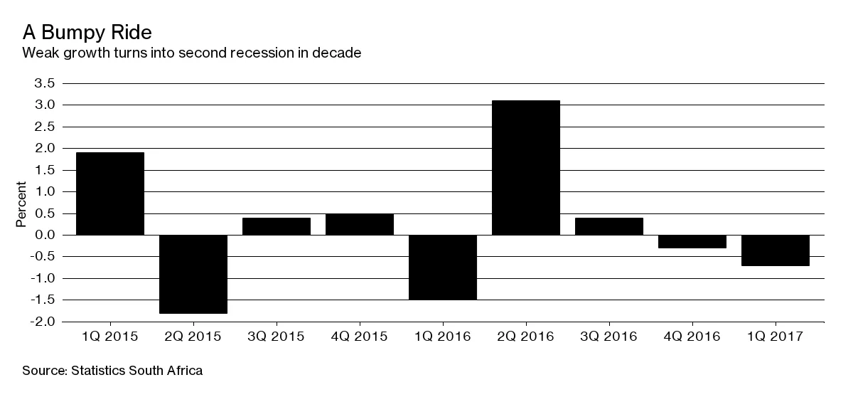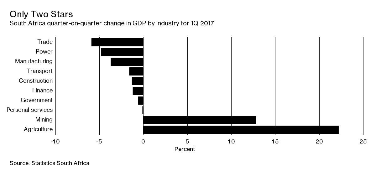 雅各布·祖马的反复无常的政治举动正在滋生政策不确定性和投资的犹豫,这有助于解释为什么这个大陆上工业化程度最高的国家在截至3月的三个月里连续第二个季度经济收缩。金融、房地产和商业服务自2009年第二季度以来首次萎缩。