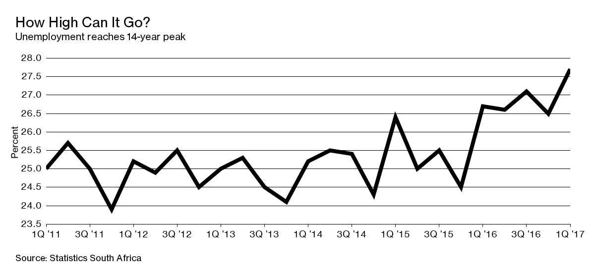 他们的就业机会也减少了:失业率在第一季度上升至14年来的最高点27.7%。南非去年的经济增长放缓至0.3%,是自2009年以来的最低水平,低商品价格、2015年干旱的影响以及对本地制造商品的需求疲软都对产出造成了压力。