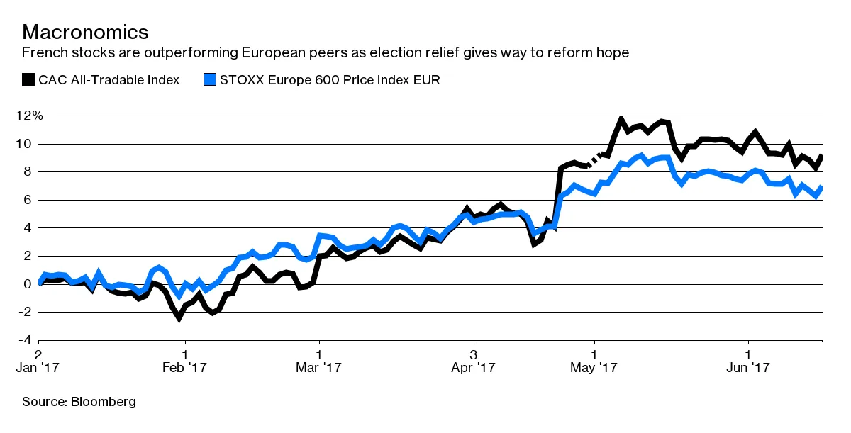 当然,正如英国的特蕾莎·梅所证明的,政治中事情可能会迅速变得丑陋。想象如果马克龙未能兑现他的早期承诺,法国可能会发生什么,这让人感到不安。但至少目前,他的崛起对那些押注于急需改革法国劳动市场的股东和首席执行官来说看起来是个好消息。结果,法国应该更容易吸引投资。