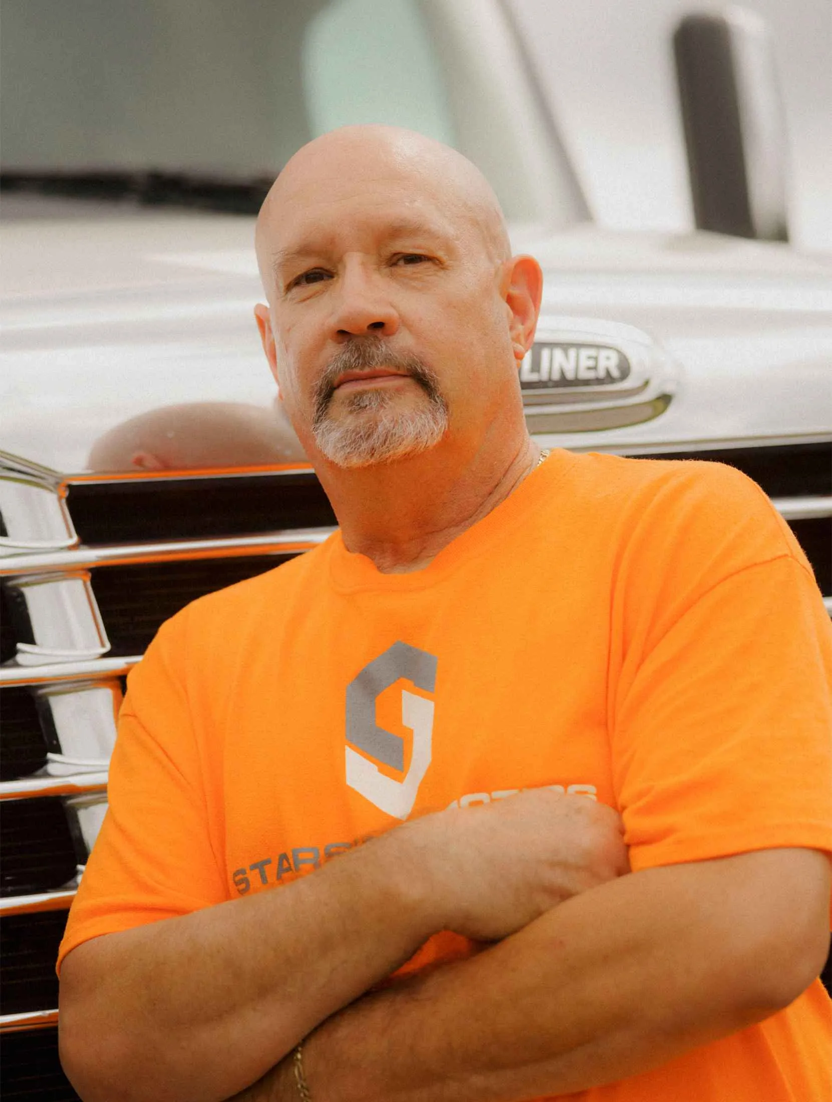 Jeff Runions,一名Starsky卡车司机,坐在Buster的前座上,Buster是一辆Starsky租赁的最新款Freightliner Cascadia,配备了摄像头和传感器。他瞥了一眼Kevin Keogh,一位出生于爱尔兰的人工智能专家,曾在捷豹路虎工作,此时他正在对Starsky代码进行最后的调整,而Runions则在驾驶。