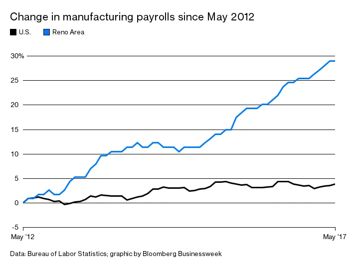 “特斯拉所做的是将我们的成功放大,通过强化信息,”西内华达经济发展局局长迈克·卡兹米尔斯基(Mike Kazmierski)说。自那以后,更多公司在该地区扩展或迁移。雷诺的失业率首次降至4%以下,而该地区最快的就业增长来自制造业,雇佣了近15000名工人,过去两年增长了15%。