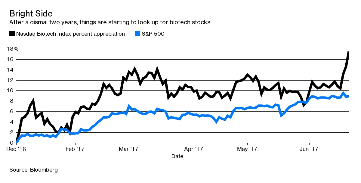 这一消息使纳斯达克生物技术指数在周三上涨了4%,这是自希拉里·克林顿选举失利以来的最大涨幅,她被认为对制药行业的态度甚至比特朗普更不友好。尽管这一反弹仍处于初期阶段,但有理由认为它有可能持续。