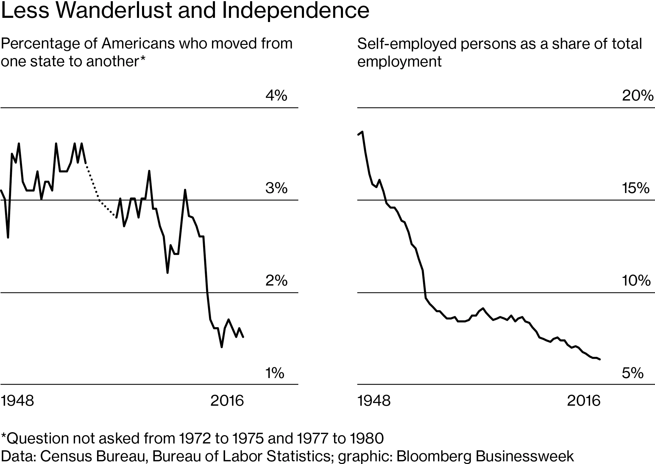 根据劳工统计局的数据,自雇在过去十年中占整体就业的比例略有下降,远低于1950年代的水平。