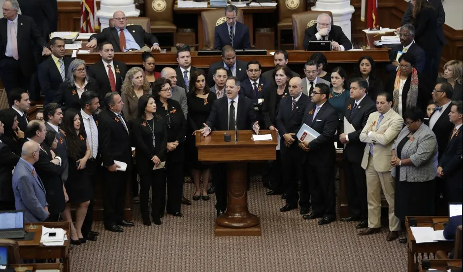 德克萨斯州代表拉斐尔·安基亚在国会大厦埃里克·盖伊/AP来自德克萨斯州各城市的市长和市议会成员今天聚集在圣安东尼奥,进行一场大规模的全州努力,试图推翻一项针对避难城市的新法律。参议院法案4,是全国最具攻击性的此类法律,对拒绝遵守联邦移民请求的辖区施加严厉的惩罚,并允许任何执法人员——甚至是大学或学区的校园警察——询问他们拦截的任何人的移民身份。