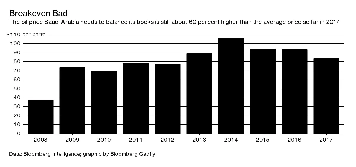 除此之外,即使沙特阿拉伯及其朋友们帮助将石油价格推高到每桶65美元,这仍然无法弥补该国预算中出现的赤字。尽管沙特阿拉伯的 breakeven 石油价格——即不再消耗外汇储备的价格——正在下降,但根据彭博情报,它仍然高于每桶80美元: