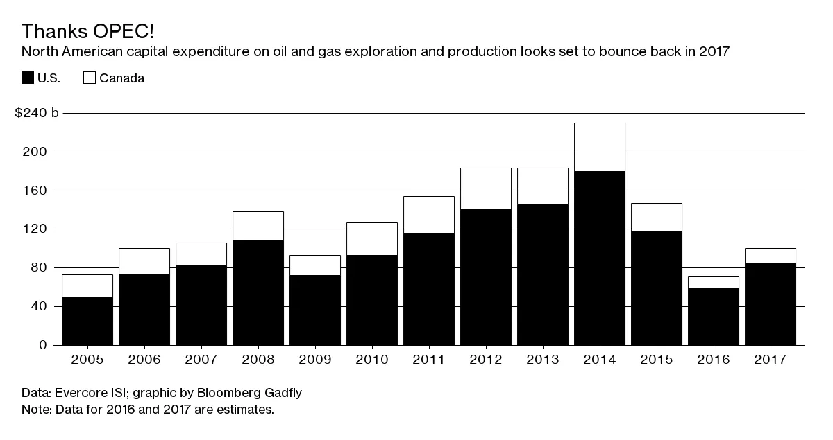 彭博社商业周刊他们不是隐士。寻求庇护者占据了拜登承诺关闭的监狱美国正在用寻求庇护者填满臭名昭著的前监狱大学橄榄球需要向大联盟学习一课那些销售比职业选手更多棒球棒的网红兄弟们本月早些时候,券商Evercore ISI发布了其全球勘探和生产行业支出计划的调查。除了其他事项外,它确认了今年大部分时间以来显而易见的事实;即沙特阿拉伯、俄罗斯和其他国家去年11月宣布的减产对页岩油行业的影响如同四倍浓缩咖啡。在之前的更新中,Evercore ISI主要基于11月之前收集的反馈,表示预计2017年北美的石油和天然气支出将增长21%。大约六个月后,这一数字上升到了41%。