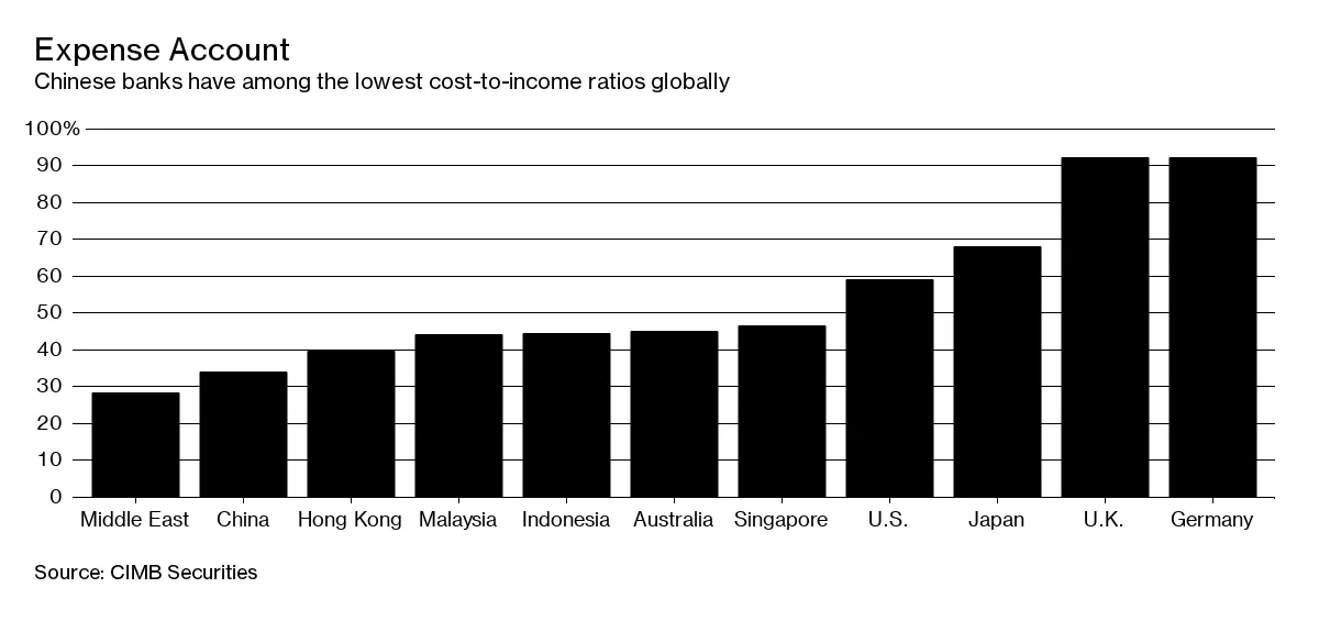在借贷方面,中国的大银行很难被超越。他们的成本基础是世界上最低的之一。此外,去年员工人数减少了约1%,并且关闭了分支机构,进一步降低了开支。