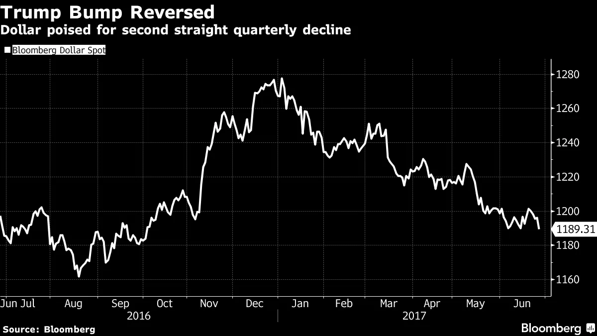 印刷货币减少的前景使得欧洲共同货币迎来了多年来最好的交易日之一,彭博欧元指数飙升至2015年以来的最高水平,涨幅高达1.27%。德国国债暴跌,10年期收益率创下自2015年以来的最大涨幅,甚至带动了国债收益率的上升。即将到来的更紧的金融条件对股票造成了压力。“这是我对市场的消息:中央银行不再是你们的朋友,”林赛集团的首席市场分析师彼得·布克瓦尔在给客户的报告中写道。“大约10年的非常规政策即将结束——目前如此——因为美联储、欧洲央行、日本银行、英格兰银行、加拿大银行以及可能还有其他一些银行正在撤回你们一直依赖的货币药物,这些药物推动了资产价格的飙升。”欧元再强,美元也同样疲弱还记得特朗普总统在四月说美元变得太强,而这部分是他的错,因为人们对他有信心吗?我想知道他现在会怎么说——或者发推特——呢?美国的货币看起来像是外汇市场的病人。彭博美元现货指数交易于自十月以来的最低水平。它正处于自2014年上半年以来首次连续两个季度亏损的边缘。国际货币基金组织周二下调了其对美国经济的展望,取消了对特朗普减税和增加基础设施支出以刺激增长的假设。现在的预测是增长2.1%,低于国际货币基金组织四月更新的世界经济展望中的2.3%。国际货币基金组织还将对明年美国增长的预测从四月的2.5%下调至2.1%。更糟的是,对美国领导力的看法正在急剧下降。根据皮尤研究中心对37个国家的公众调查,美国的好感度从奥巴马总统任期结束时的64%降至49%。
