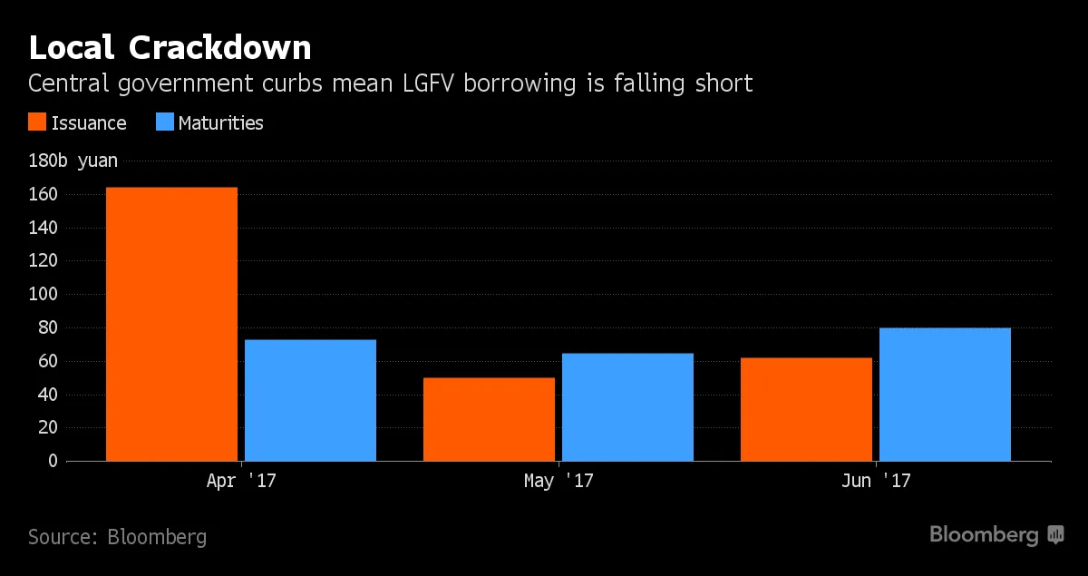 中国准备迎接关键借款人的首次违约中国可能终于准备好切断与该国困扰的地方政府融资工具的联系。北京的去杠杆化行动导致了更严格的规则,影响了地方政府融资工具的债务再融资,促使这些工具的发行量大幅下降,它们欠债权人约5.6万亿元人民币(8180亿美元)。一些人甚至将它们视为中国金融危机后债务困境的典型代表,根据彭博社的Helen Sun和Jing Zhao的报道。财政部于4月26日发布的通知禁止市政府将公共资产或土地的所有权转让给地方融资公司,并禁止使用土地销售收入来帮助这些工具偿还债务。此举“有效地关闭了”北京对这些工具的支持,因为这是它们增强偿还能力的关键方式,穆迪投资者服务公司大中华区信用研究负责人Ivan Chung表示。“中央政府可能需要一个地方政府融资工具的违约,以向市场发出明确信号,表明它不会总是救助它们。” 允许其中一个工具违约将是北京的一个转变,投资者一直将其支持视为当局为维持经济复苏所付出的努力的象征。