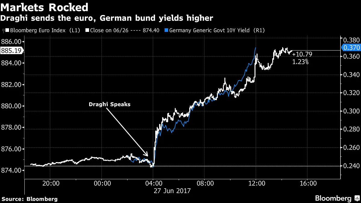 谈到对市场的影响,珍妮特·耶伦和黑田东彦在马里奥·德拉吉面前毫无优势。欧洲中央银行行长仅仅通过表示通缩力量已被再通胀力量取代,就震撼了货币、债券和股票——不仅仅是欧洲的市场。