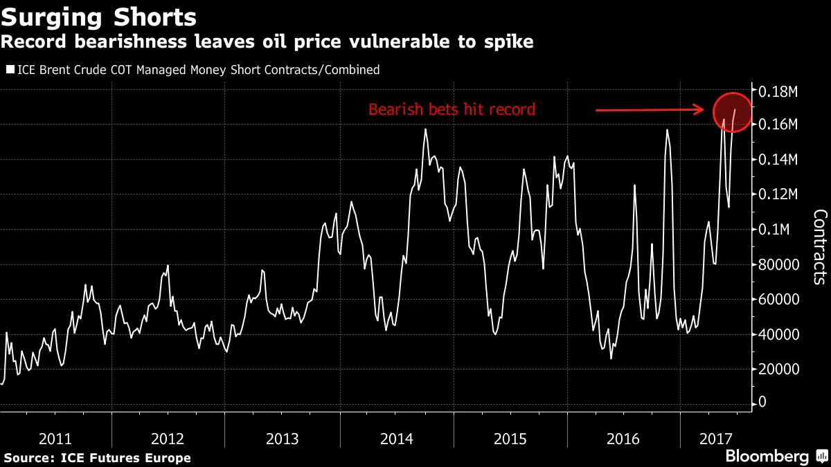 石油找到了立足点纽约原油价格连续第四天上涨,收于每桶44美元以上,这是一个月以来最长的涨势,此前价格曾跌入熊市。根据彭博社的Meenal Vamburkar的报道,预计美国原油库存继续从创纪录水平下降,已缓解了对全球供应过剩的紧张情绪。彭博社的一项调查显示,上周库存可能下降了200万桶,能源信息署的报告将在周三发布。考虑到目前对基准布伦特原油的看跌押注比至少六年来的任何时候都要多,可能还有其他因素在起作用。但对许多交易者来说,这只是意味着石油适合进行所谓的“回补”反弹——即那些出售合约希望从价格下跌中获利的交易者买回合约以获取利润或避免损失,彭博社的Alex Longley和Javier Blas表示。根据交易所数据,上周投机者持有的布伦特空头头寸上升至1.69亿桶,为2011年开始记录以来的最高水平。商品交易公司创始人Thibaut Remoundos表示:“市场容易受到非常剧烈的回补行情的影响。”