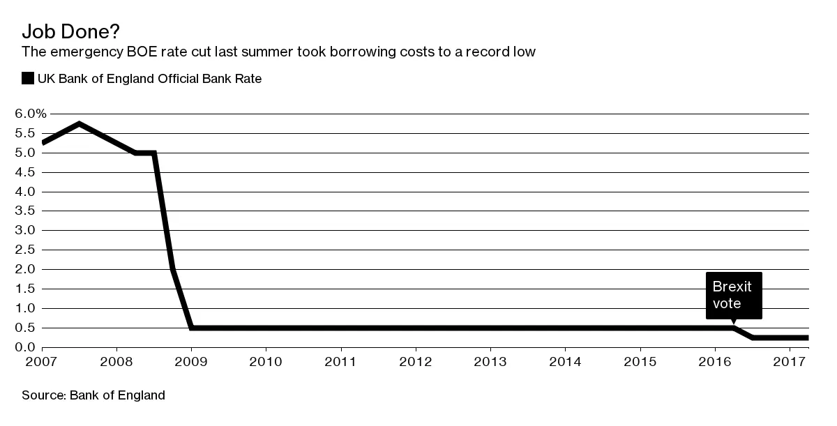 去年针对意外的脱欧公投结果注入的大部分刺激措施仍然活跃且有效。英格兰银行首席经济学家安德鲁·哈德恩在上周的讲话中提到,这种宽松的影响使他转变为鹰派。他表示,去年8月的25个基点的降息只是货币刺激的一部分——额外的700亿英镑(895亿美元)的量化宽松构成了其余部分。