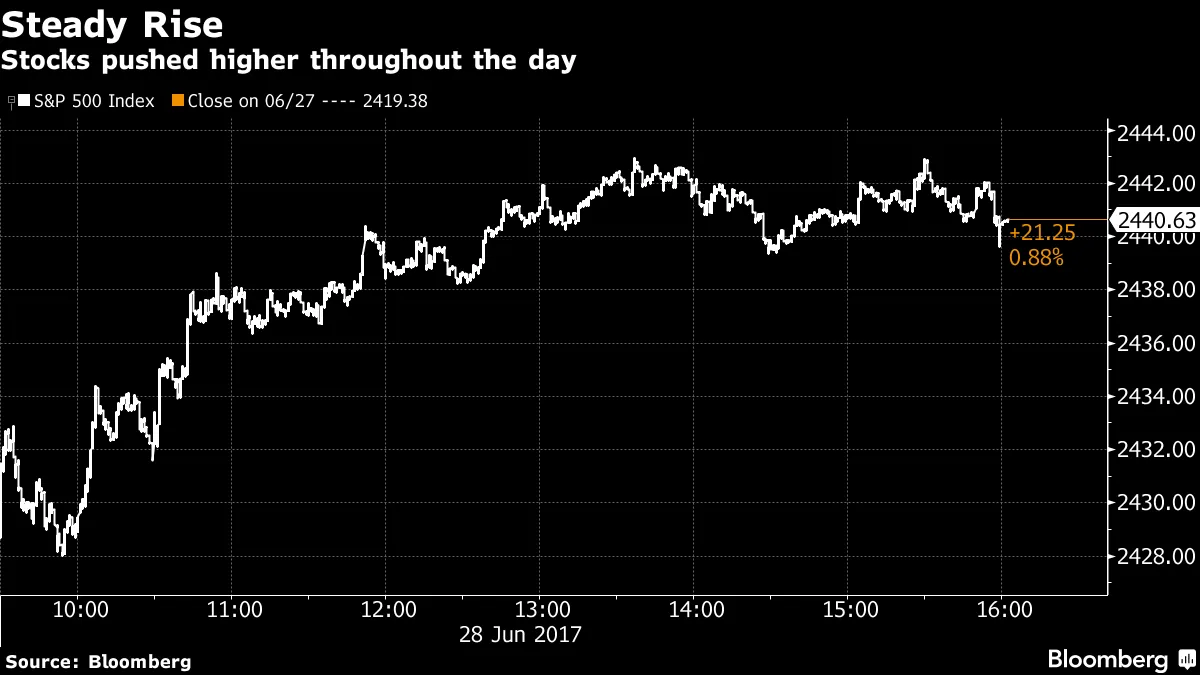 在如此多的不确定性面前——政治、民粹主义、恐怖主义——隐含波动性如此之低的一个原因是中央银行通过其宽松货币政策给市场注入了活力。根据美银美林的数据,中央银行在今年截至5月购买了创纪录的1.5万亿美元资产。这相当于每月向市场注入3000亿美元。“中央银行撤回流动性这一‘酒杯’对短期波动性的前景并不乐观,”摩根士丹利的货币策略师在一份研究报告中表示。股票投资者稍感宽慰中央银行传递的乐观信息让对坐拥历史上最昂贵股票感到紧张的股票投资者松了一口气。标准普尔500指数自4月24日以来录得最大涨幅,上涨0.87%,从六周来的最大抛售中反弹。涨幅主要由银行股主导,受益于更高的债券收益率、科技公司以及小型股的跳涨,使罗素2000指数距离历史最高点仅差一点。股票投资者可能不想过于放松,因为根据彭博新闻的索非亚·霍尔塔·e·科斯塔,本周一系列政策制定者指出资产价格过高。耶伦在周二指出,股票估值“有些偏高”。根据预计收益率来看,美国、欧洲和新兴市场的股票估值远高于其10年平均水平。尽管估值在一段时间内保持高位而未引发抛售,但现在也伴随着全球经济背景的疲软,这已经促使摩根大通的策略师保持谨慎。