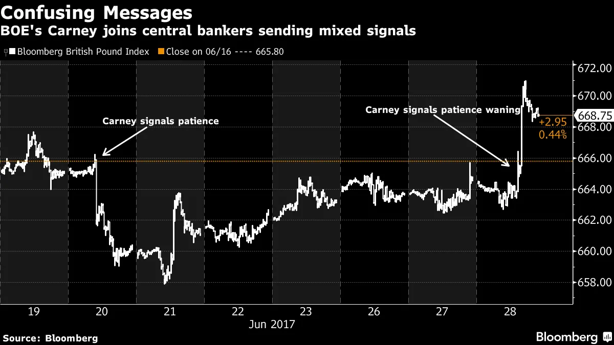 就在英格兰银行行长马克·卡尼表示现在不是加息的时候不到一周后,这一观察导致英镑大幅下跌并使国债飙升,他在周三反转了自己的立场,表示政策制定者可能需要开始加息,并将在未来几个月进行讨论。这一次,英镑飙升,国债遭受打击。在欧洲中央银行行长马里奥·德拉吉通过表示欧元区经济的再通胀为撤回非常规措施创造了空间而震撼市场的一天后,熟悉德拉吉思维的欧元体系官员暗示交易者误判了这次讲话,认为其过于鹰派,导致欧元放弃了涨幅,债券也收复了大部分损失。美联储主席珍妮特·耶伦本周重申,美国中央银行准备进一步收紧政策,尽管通胀和增长尚未达到目标。