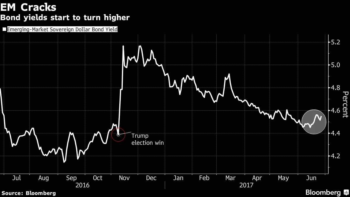 债务泛滥新兴市场债务投资者刚刚收到几条坏消息。首先,国际金融协会在周二晚些时候表示,发展中国家经济体的借贷几乎没有放缓的迹象,因为截至3月31日的一年内,它们的债务增加了3万亿美元,达到了56万亿美元。然后在周三,正确预测了今年新兴市场债务大规模流入的贝莱德基金经理表示,他们现在正在收紧看涨押注,根据彭博新闻的Selcuk Gokoluk和Natasha Doff的报道。根据全球最大基金经理的Pablo Goldberg和Sergio Trigo Paz的报告,新兴市场债务的回报率将在今年剩余时间内放缓至2%到3%之间。“推动新兴市场在上半年上涨的动力在下半年可能会减弱,”他们在一份电子邮件研究报告中表示。“我们可能正在缓慢进入一个量化紧缩的时期,债券市场可能需要学习如何消化。”根据美银美林的研究,引用EPFR Global的数据,超过400亿美元的新投资在连续21周的流入中涌入新兴市场债务基金。