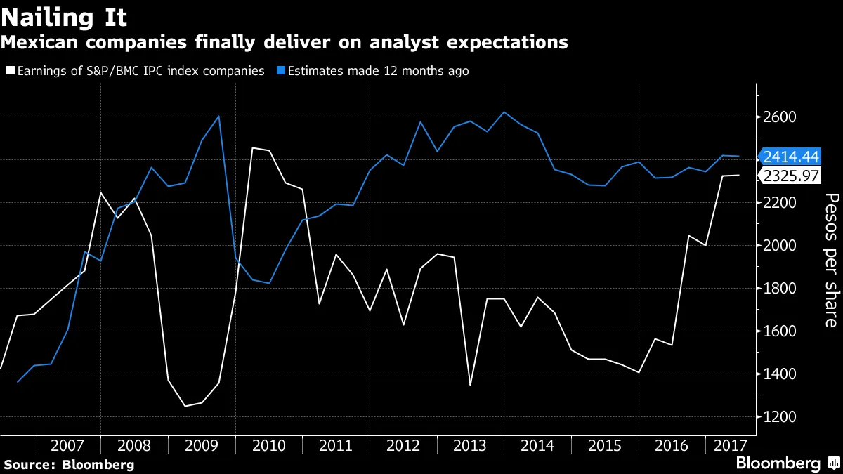 墨西哥崛起今年墨西哥比索的反弹备受关注,这可能或可能不代表特朗普政府对美国南方邻国的政策。较少为人知的是墨西哥股票的反弹。基准S&P/BMV IPC指数今年以美元计上涨了25%,越来越多的公司开始首次达到自2010年以来的盈利预期。分析师预测与实际盈利之间的差距缩小,表明股票反弹可能会继续,Srinivasan Sivabalan和Aline Oyamada表示。“去年底和今年初,由于特朗普的到来造成的不确定性,墨西哥的负面情绪非常严重,”瑞士银行的首席拉美经济学家Rafael de la Fuente说。自那时起,“墨西哥的基本面有所改善。我们消除了对墨西哥的某些负面关注。”BTG Pactual的分析师Carlos Sequeira将墨西哥股票评级上调至超配,理由是州选举的积极结果以及对北美自由贸易协定重组可能对墨西哥产生建设性影响的信心。