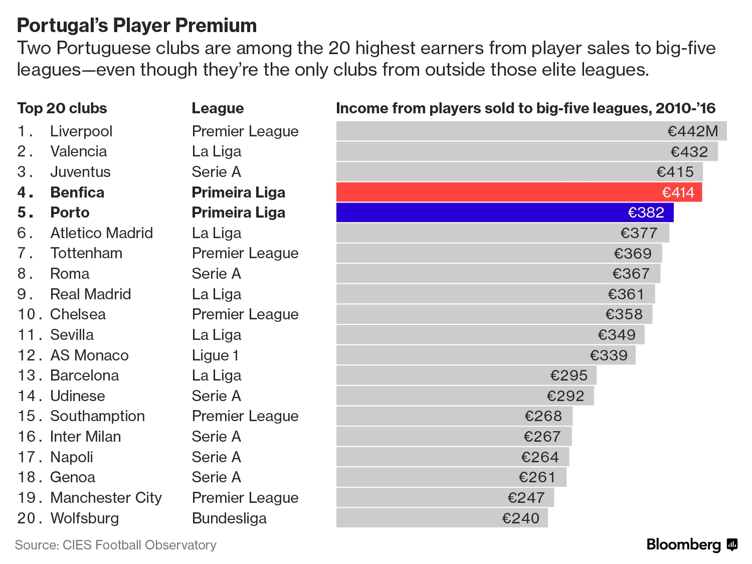 培养和出售球员意味着这两家里斯本俱乐部尽管面临成本,仍然能够盈利。根据里斯本经济与管理学院的数据显示,本菲卡、体育和波尔图三家俱乐部的债务总额约为7.2亿欧元。很多债务仍然源于在2004年葡萄牙举办欧洲锦标赛之前建造的新体育场。