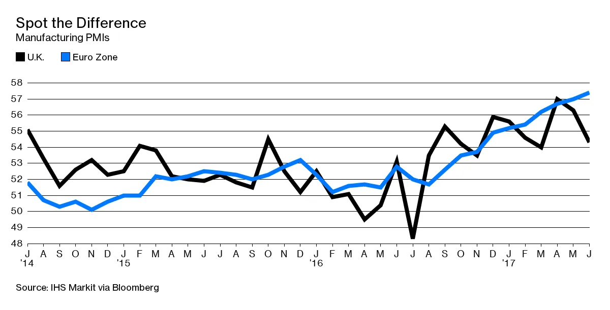 自英国投票决定脱离欧盟以来,英国消费者信心已降至最低水平,而欧元区的经济信心则达到了十年来的最高水平。周一发布的数据显示,英国制造业处于三个月来的最低水平,而欧元区的制造业则以六年来最快的速度扩张。