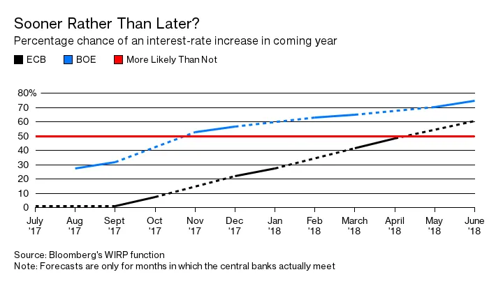 交易员们预计英格兰银行将比欧洲中央银行更快地提高利率:投资者认为前者在今年年底之前收紧政策的机会超过50%。而欧元区机构的任何举动被视为几乎要等到一年后。