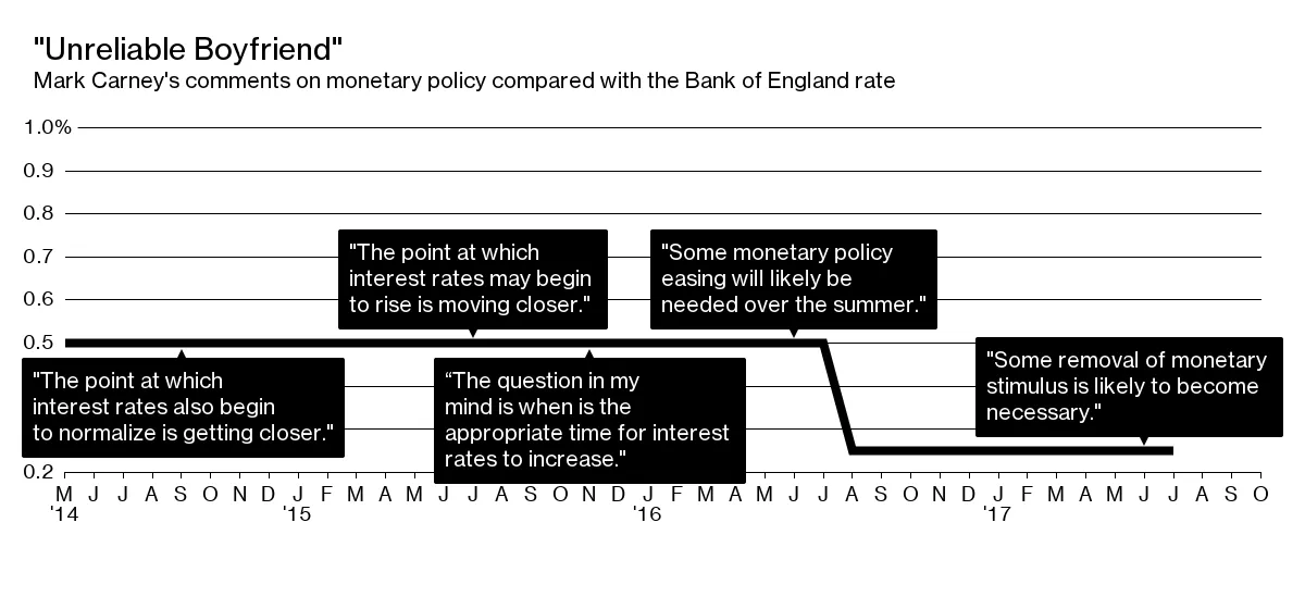 自从一位英国立法者称英格兰银行行长马克·卡尼为“不可靠的男朋友”以来已经过去三年,他因调情并随后拒绝提高利率而被如此称呼。今天,交易员和投资者面临的问题是,他是否再次假装对更紧的货币政策感到热情。