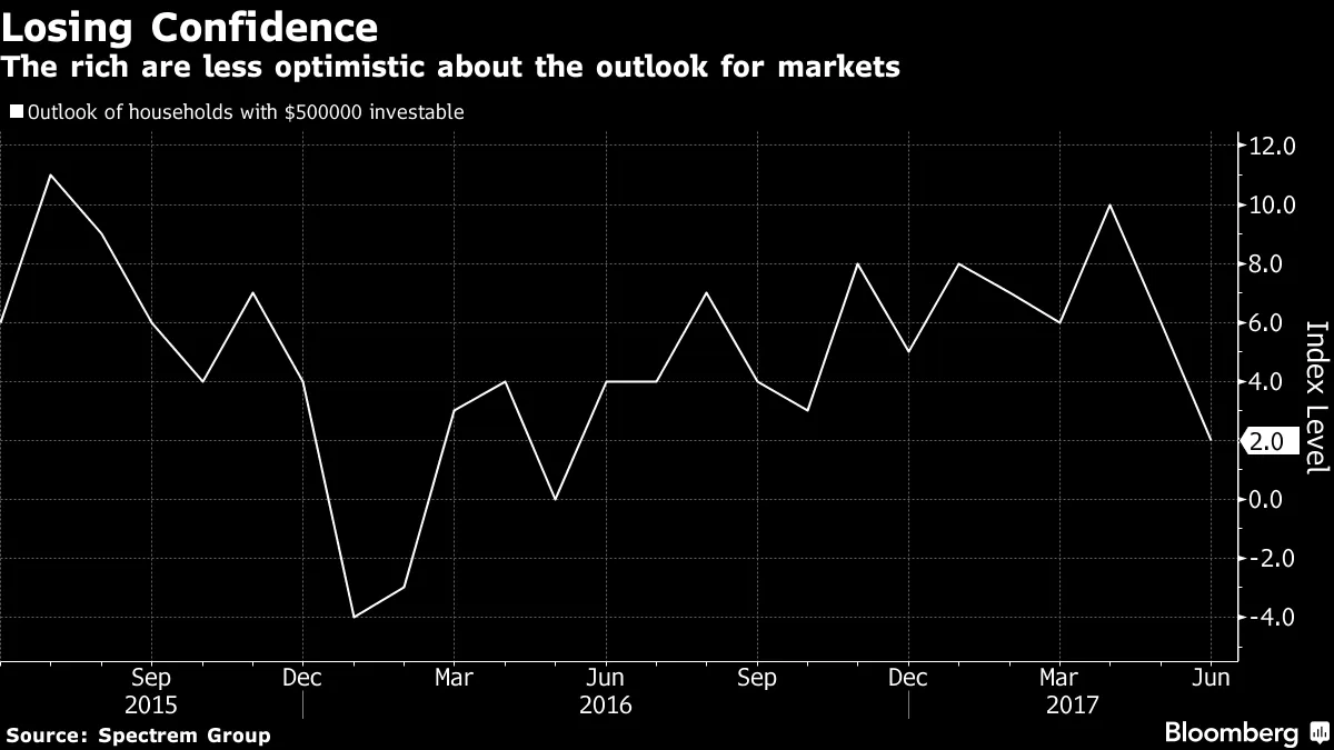 富裕者正在失去信心周三带来了更多的轶事证据,表明投资者可能不指望美国在短期内进行广泛的税制改革和减税,尽管上周唐纳德·特朗普总统的首席经济顾问加里·科恩表示,政府“百分之百致力于”在明年的税季之前完成某些事情。研究公司Spectrem Group的富裕投资者信心月度指数已降至一年以来的最低水平。这一点值得注意,因为税收减免往往使最富裕的人受益,他们能够为退休储蓄更多,并面临更高的所得税。布朗大学经济学副教授约翰·弗里德曼在五月告诉彭博新闻的苏珊娜·伍利,富裕者是积极的储蓄者,而积极的储蓄者占所有储蓄者的15%到20%。USAA的首席投资官约翰·斯皮尔在市场评论中表示:“市场可能没有放弃特朗普政府的经济计划,但2017年初的高期望已转变为更为温和的目标。”Spectrem的调查基于对250名拥有超过50万美元可投资资产的财务决策者的访谈。