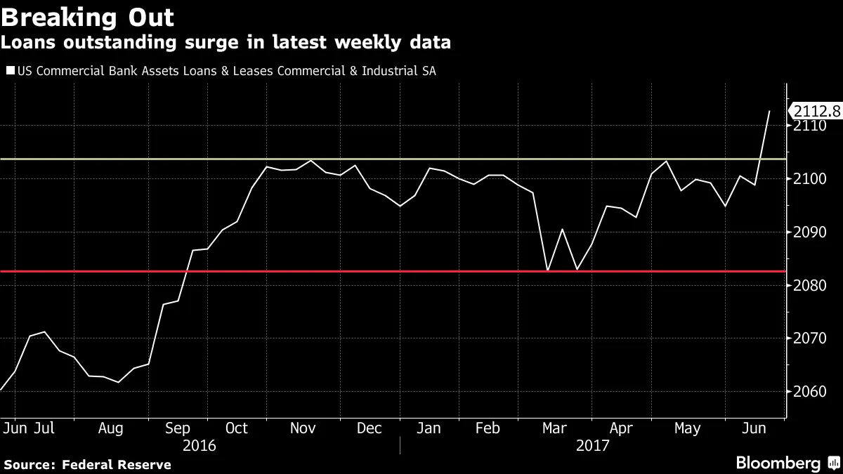 银行再次放松了钱包的绳索最新的每周美联储商业和工业贷款数据几乎没有引起关注,可能是因为它是在上周五晚些时候发布的,而对于许多人来说,由于独立日假期在今年的星期二,形成了一个额外长的周末。重要的是要知道,贷款 似乎终于要摆脱 七个月的低迷。最新一周140亿美元的跳升是自2016年3月以来的最大增幅,使总额达到了2.113万亿美元。在11月初到6月中旬之间,商业和工业贷款的金额在2.03万亿到2.10万亿之间波动。皮博迪杰夫瑞的经济学家称这种放缓令人担忧,他们指出,这类贷款是商业投资的关键融资来源,对整体增长至关重要。他们在6月19日的报告中表示,回落似乎并不是由于更严格的贷款标准,而是与需求疲软有关,从而增加了经济衰退的可能性。