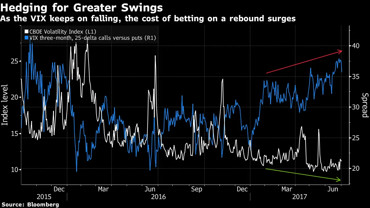 周三,股票几乎没有任何波动,进一步强化了投资者对任何潜在危险过于自满的观念,并且保持了超出合理范围的低波动性。毕竟,如何解释在华盛顿政治动荡、全球不断出现的地缘政治风险以及中央银行发出即将收紧货币政策的信号的情况下,股票和其他高风险资产今年的强劲反弹呢?这可能是因为投资者进行了对冲?随着CBOE波动率指数今年持续走低,投资者越来越愿意支付保护措施以防止反弹,导致看涨期权与看跌期权的成本达到自2015年10月以来的最高水平,彭博新闻的塞西尔·瓦努奇报道。