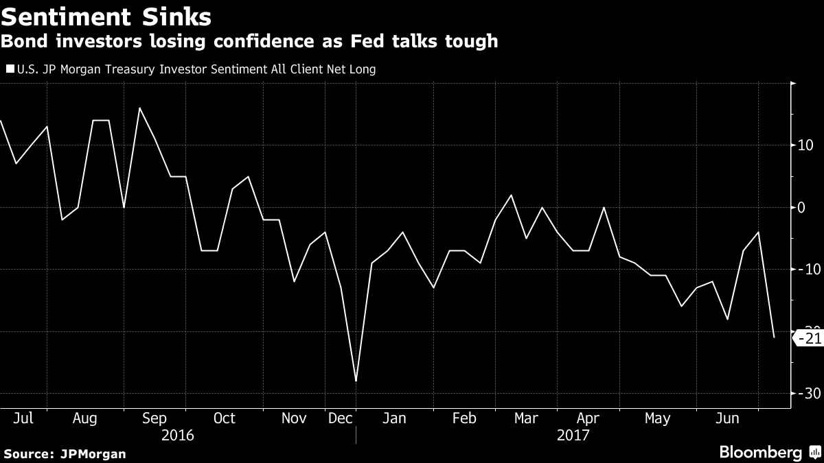 根据瓦努奇的说法,今年VIX期权的交易量激增,平均每天几乎有680,000份合约成交。每交易一份看跌期权,几乎有2.7份看涨期权交易,这是自2007年以来的最高水平。看涨期权与看跌期权的比例约为4比1,是自2014年9月以来的最高水平。**所有积极的债券情绪发生了什么?**债券市场的波动性可能相对较低,但这并不意味着投资者看涨。摩根大通对固定收益投资者的每周调查显示,情绪已降至今年的最低水平。尽管最近的通胀数据低于预期,但美联储官员最近几周表示,他们对消费者价格将很快加速上涨充满信心,因为经济处于充分就业状态,这为进一步加息提供了理由。即使不然,一些中央银行官员表示,目前的宽松金融条件和资产价格上涨也需要更多的加息。这可能有助于解释基准10年期国债收益率从6月26日的2.12%上升至2.33%。美联储主席珍妮特·耶伦上个月表示,使用传统指标如市盈率来看,资产估值“显得有些高”。周三发布的美联储上次会议的会议纪要显示,金融条件在会议上进行了讨论,一些与会者认为“投资者的风险承受能力增加”可能正在推高资产价格,而其他人则表示担忧“市场波动性低”可能导致金融稳定风险。