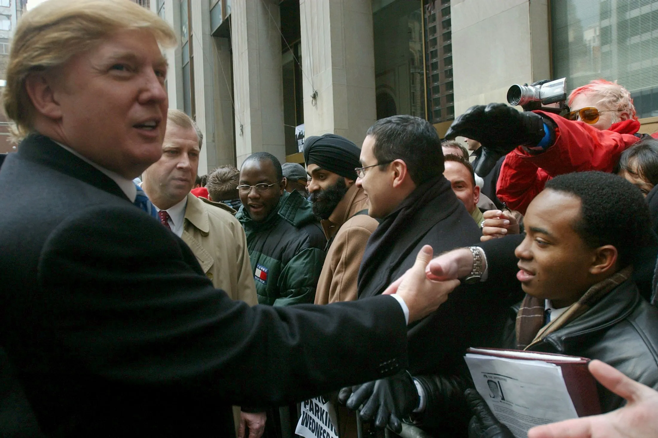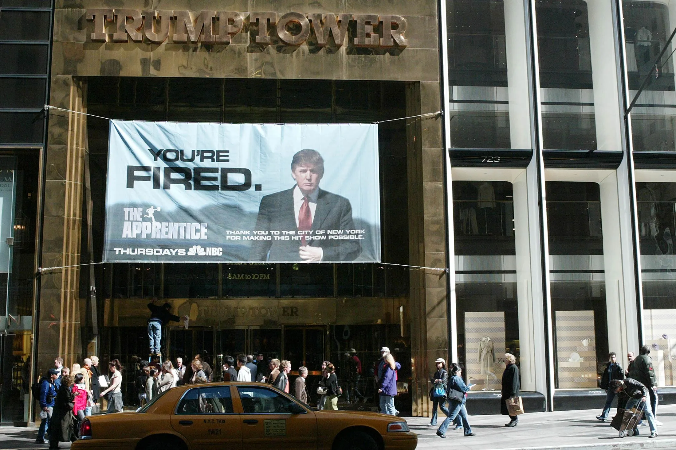 一开始,学徒 就大获成功。在它的第一季中,这档节目每周吸引了超过2000万观众。那是现实电视时代的黎明,而特朗普的卡通化形象与这一新媒体完美契合。每周,特朗普都会在看似奢华的、镶有胡桃木的董事会会议室中主持节目。每周,在节目的最后,特朗普都会用他标志性的短语解雇一位参赛者:“你被解雇了!”