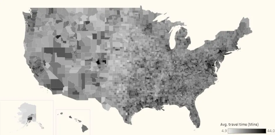 统计学家切斯·索耶对此有答案,他提供了一个非常详细的可视化,展示了每个美国县的典型通勤时间。基于2011年至2015年的数据,来自美国人口普查局,该互动地图显示,宾夕法尼亚州的派克县居民的通勤时间最长,平均为44分钟。与此同时,阿拉斯加的前10个最快通勤时间则是阿留申东区,其平均通勤时间为4.9分钟。如果你对这个地方不熟悉,它是一个海狮点缀的岛链,深入海中;可以推测,通勤者在这些小镇上只需走几条街就能到达目的地。