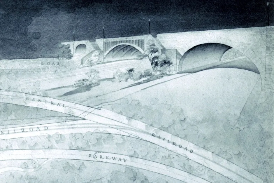 提议的等级交叉口消除细节,索米尔河公园大道与塔里敦路,1931年。由迈克尔·拉普阿诺渲染。感谢托马斯·J·坎帕内拉。这个夏天,当纽约人前往长岛的海滩城镇和南州公园大道的公园时,他们将经过一系列在罗伯特·A·卡罗1974年关于罗伯特·摩西的纪念性传记中声名显赫的高架桥,权力经纪人。