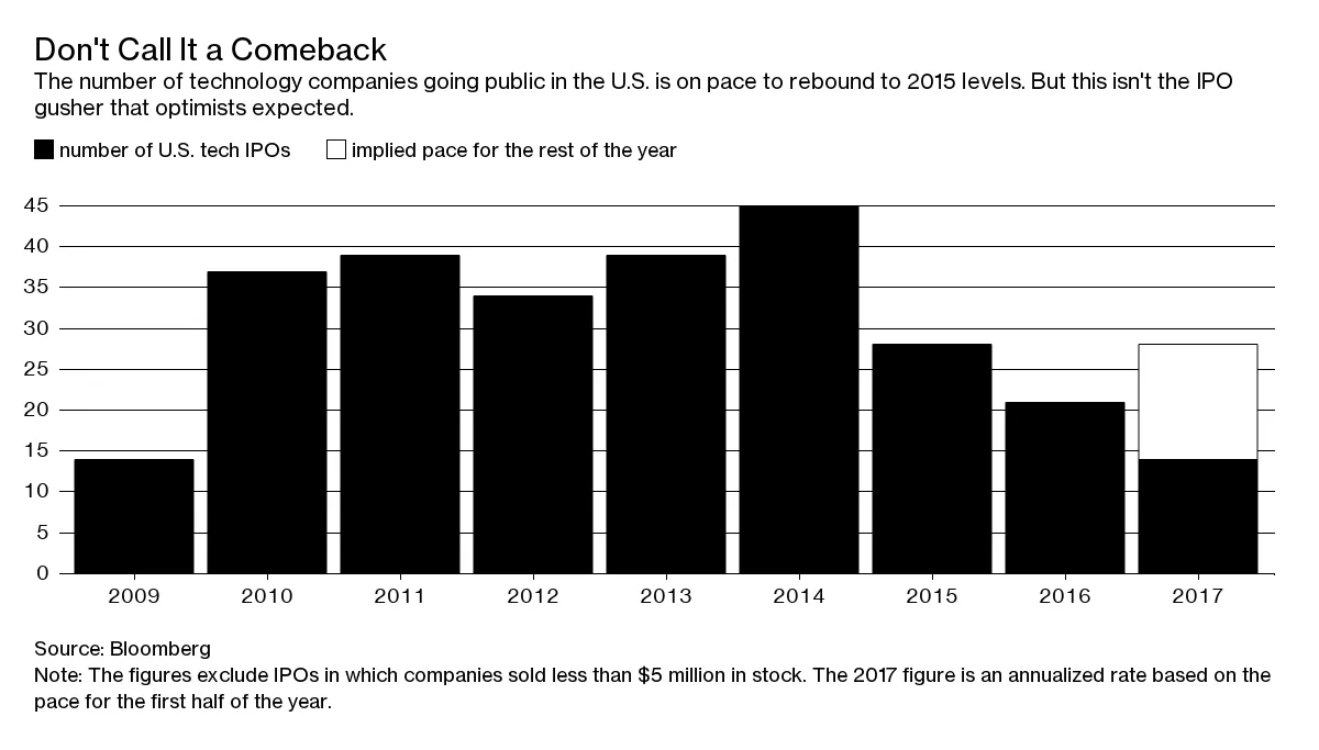在2017年之前就有预测称这将是硅谷大解堵的开始。首次公开募股(IPO)将会有一个大反弹。然而,IPO的表现却平平。根据彭博社的数据,今年到目前为止,美国约有14家科技公司上市。如果这种速度持续下去,IPO的数量将与2015年的相对温和的总数相匹配。这并不是值得自夸的事情。而2016年也被错误预测为科技IPO的辉煌年。