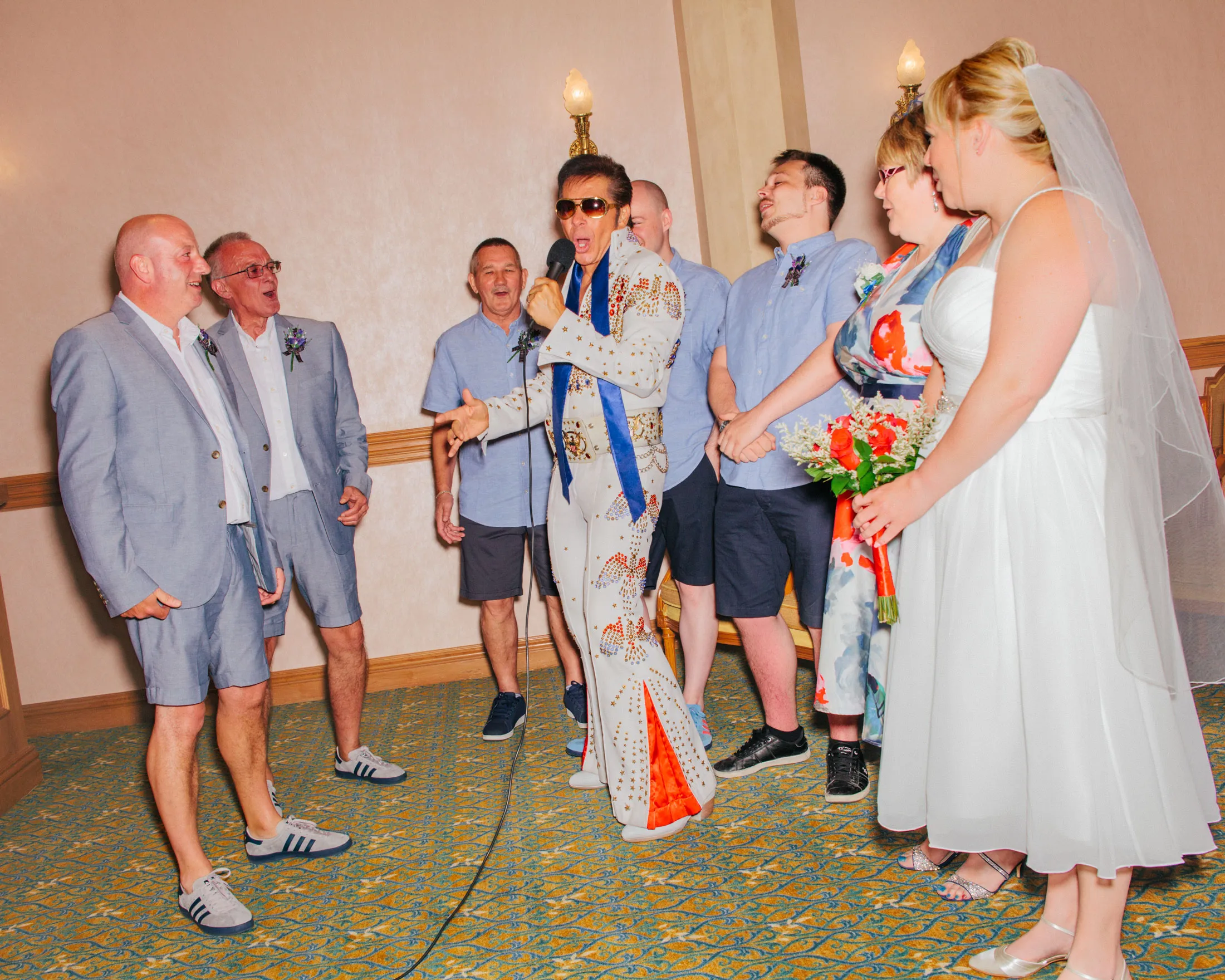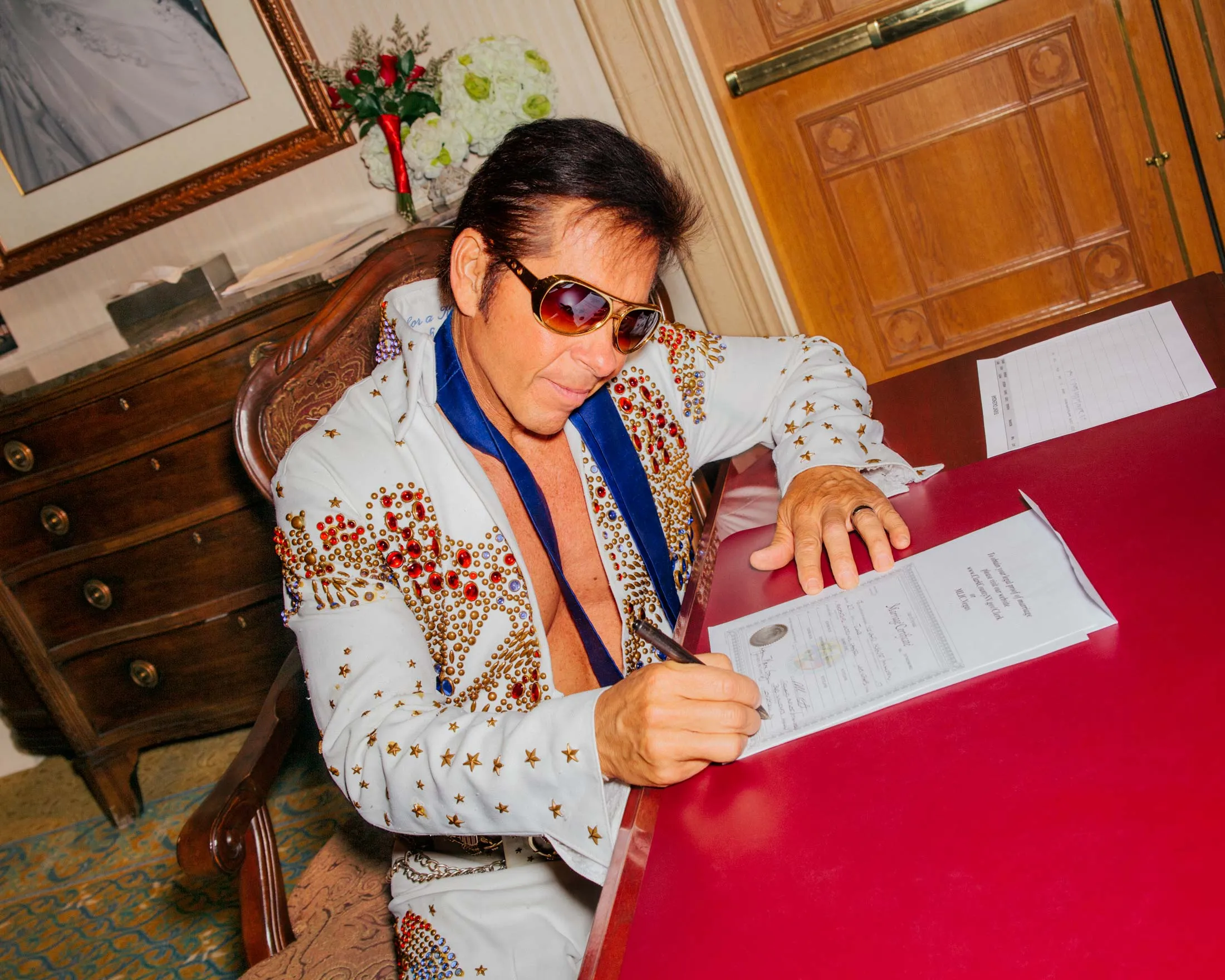 八月作为猫王在贝拉吉奥酒店的顶层与艾米·达勒姆和她的丈夫布兰登结婚,背景是六月的日落。她需要一些劝说。