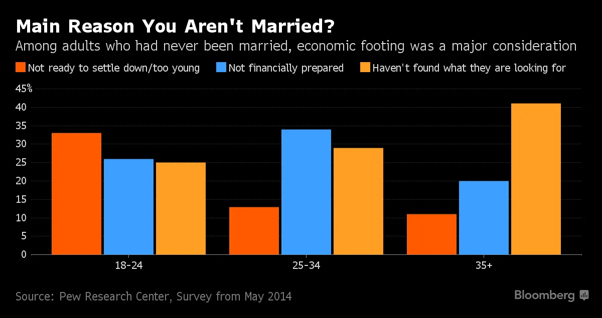 根据 皮尤研究中心的数据,2014年超过18岁的美国人中有一半已婚,低于1960年的72%。这一变化在受教育程度较低的人群中更为明显,这在一定程度上反映了收入:截至2014年,几乎75%的拥有学士学位的女性在40岁出头时已婚,而只有高中毕业的女性中这一比例不到60%,根据布鲁金斯学会的数据。