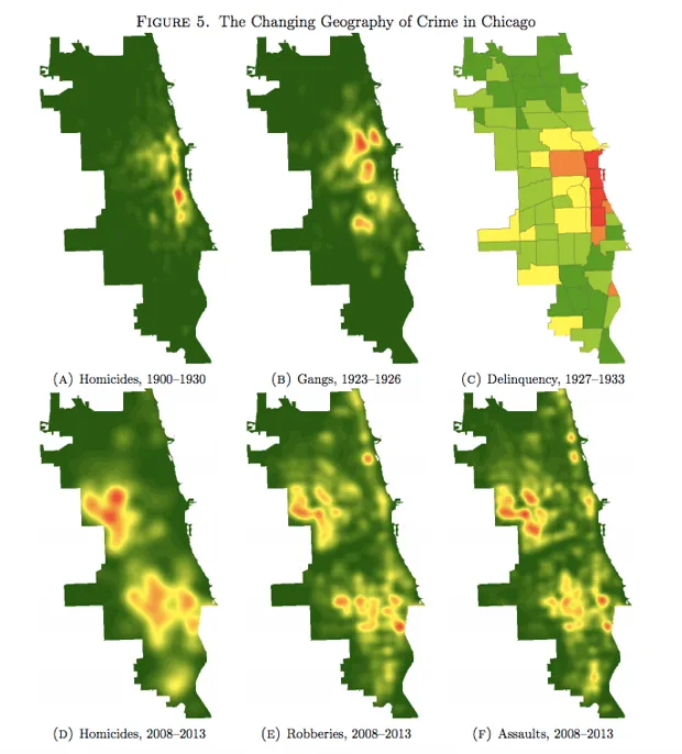 芝加哥市历史和现代犯罪的热图,作者将其作为未见邻里效应的对照。泰特·特温纳姆为了理清邻里效应,该研究还考察了追溯到1920年代和1930年代的历史土地使用和历史分区,以及追溯数十年的邻里人口统计和帮派活动的历史数据。(有趣的是,该研究发现历史分区对当前土地使用和经济活动的组成和混合有很强的影响。)