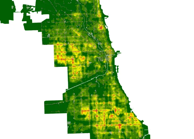 一张显示芝加哥商业空间与抢劫之间相关强度的地图。塔特·特维南这项研究为我们理解邻里特征与城市犯罪之间的联系以及城市可以采取的措施生成了几个重要结论。