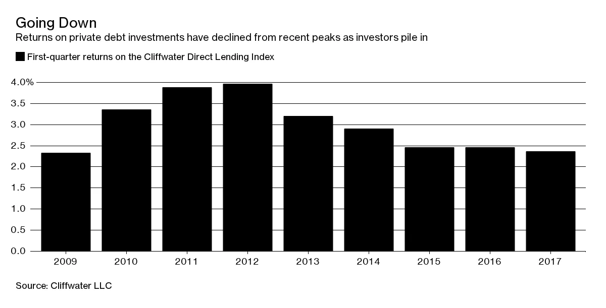 此外,这笔现金的涌入导致了收益率降低和企业估值上升,减少了未来的回报在私人公司投资上。根据Cliffwater直接贷款指数,今年第一季度,私人债务基金的预期回报率为2.36%,低于去年同期的2.46%和2012年的3.97%。