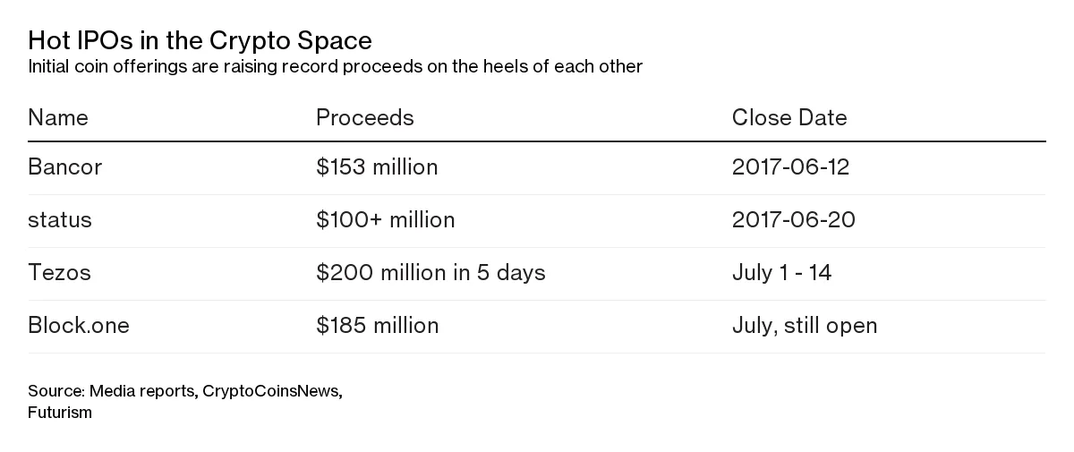 一些突出项目设定了越来越高的筹款记录,包括Bancor,该项目在6月12日结束,筹集了1.53亿美元。到7月初,Tezos和总部位于亚洲的Block One分别在短短五天内筹集了 2亿美元 和 1.85亿美元,而且这两个项目仍然对新投资者开放。