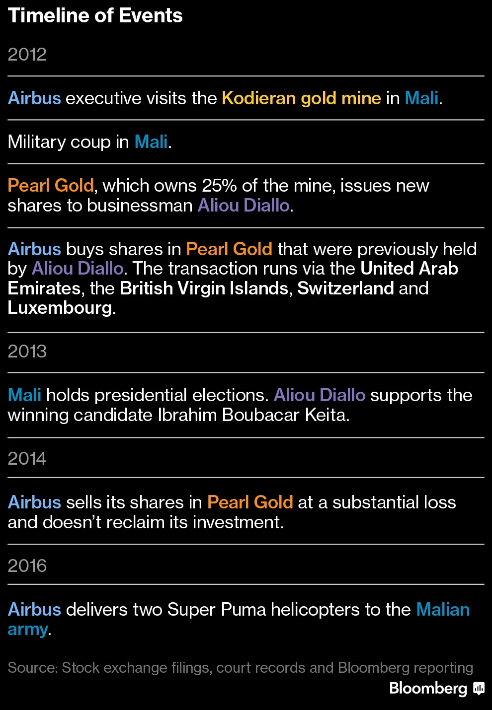 根据待决的股东诉讼,空客投资的一个核心参与者是名叫阿里乌·布巴卡尔·迪亚洛的马里人,他是一个与政治有联系的铁路工人的儿子,在法国学习,回国后通过交易马里债务致富,然后在1992年购买了矿山的控股权。
