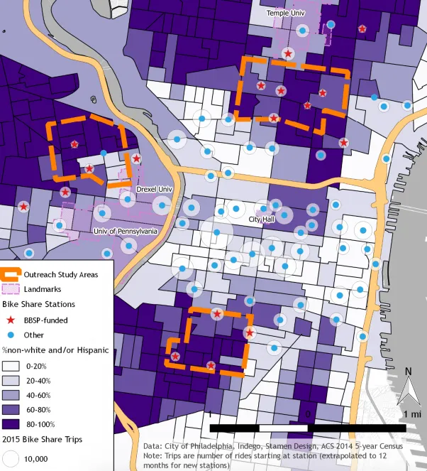 这 研究 调查了费城三个市中心邻近社区的居民,以及芝加哥的布朗兹维尔和布鲁克林的贝德斯图伊,这些地方最近都新增了自行车共享站。