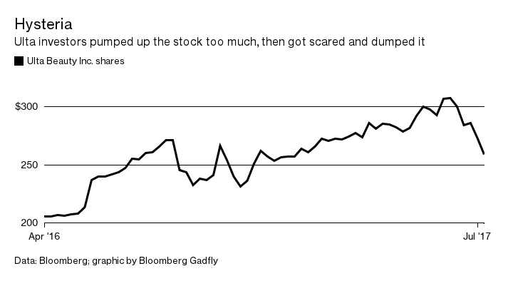 Ulta可能是美国增长最快的上市零售商之一,但它仍然是一家零售商。在其高点时,股票的估值是未来12个月预期收益的35倍,这在这个竞争激烈的行业中显然是过高的估值。然后,突然间,亚马逊公司可能会压垮Ulta股东的恐惧也随之而来,最近亚马逊通过收购Whole Foods Market Inc.的公告和Prime Day的成功拖累了一系列股票。