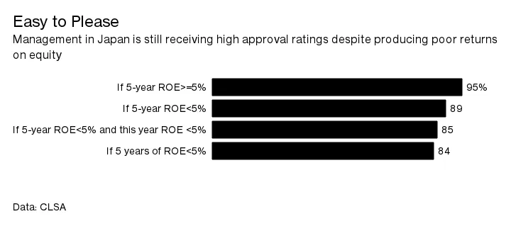 更令人担忧的是:根据CLSA Ltd.汇编的数据,那些连续五年未达到5%标准的公司,仍然获得了84%的管理层批准率。