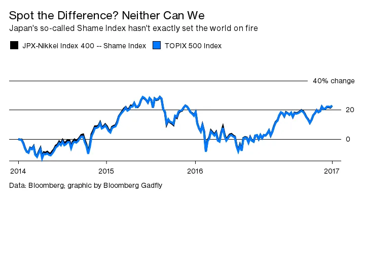 JPX-Nikkei 400指数,或称羞耻指数,始于一些轰动于2014年。它由那些承诺为股东创造利润的公司组成,衡量标准包括股本回报率和其他指标,认为那些未能达标的公司将被促使在公司治理方面采取行动。