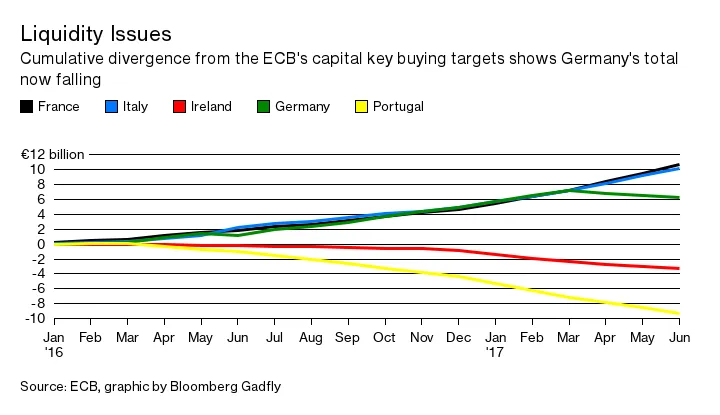 这一规则已经大幅限制了对爱尔兰和葡萄牙政府债券的购买——但到2018年初,德国和其他核心国家也将面临同样的情况。根据花旗分析师的说法,这可能在1月就会发生,尽管通过扩大范围到德国机构债务可能会延长这一时间。