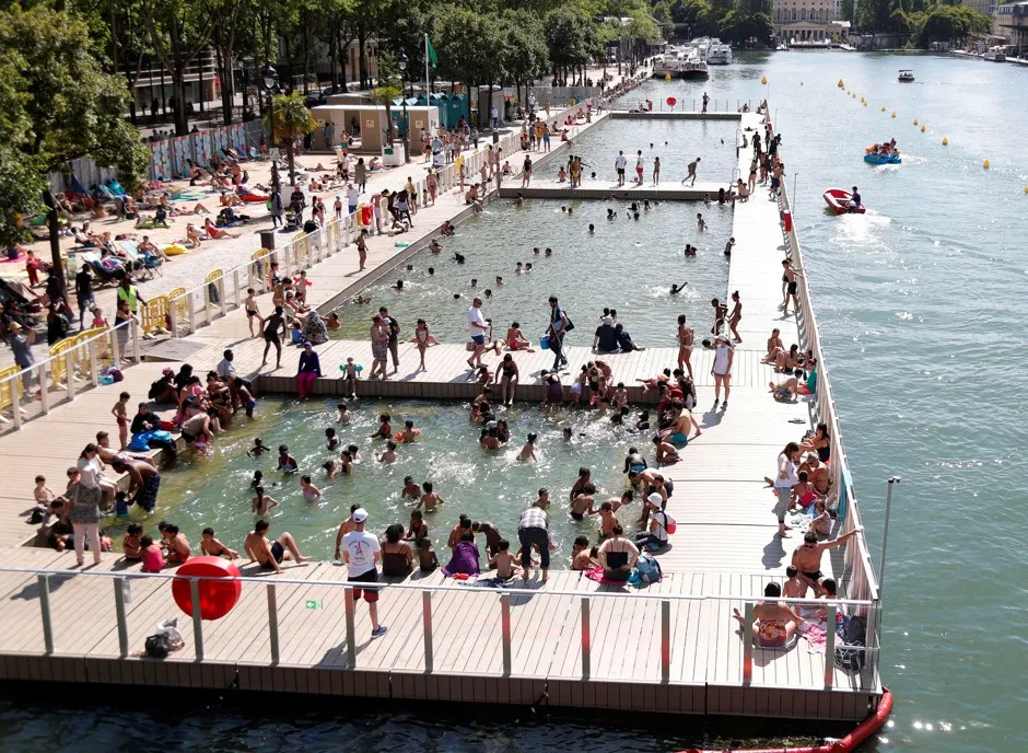 周一,巴黎市长安妮·伊达尔戈在维莱特水池开设了新的露天游泳区,这是一个为驳船建造的水池,将乌尔克运河与圣马丁运河连接起来,位于城市的东北部。在华氏90度以上的气温下,巴黎人排队在三个直接从运河水中注入的新泳池中嬉戏,泳池与水道的整体流动仅通过过滤网隔开,以防止树叶和其他物体进入。