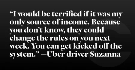 我们发现,这种灵活性的成本是相当大的。Uber承诺提供基于灵活时间表的丰厚工作,但司机基本上要承担运营汽车服务的所有费用。他们必须支付汽车、保险、清洁以及其他任何费用,而Uber则控制着报酬。如果司机生病无法工作,或者发生事故,则没有任何保护措施。