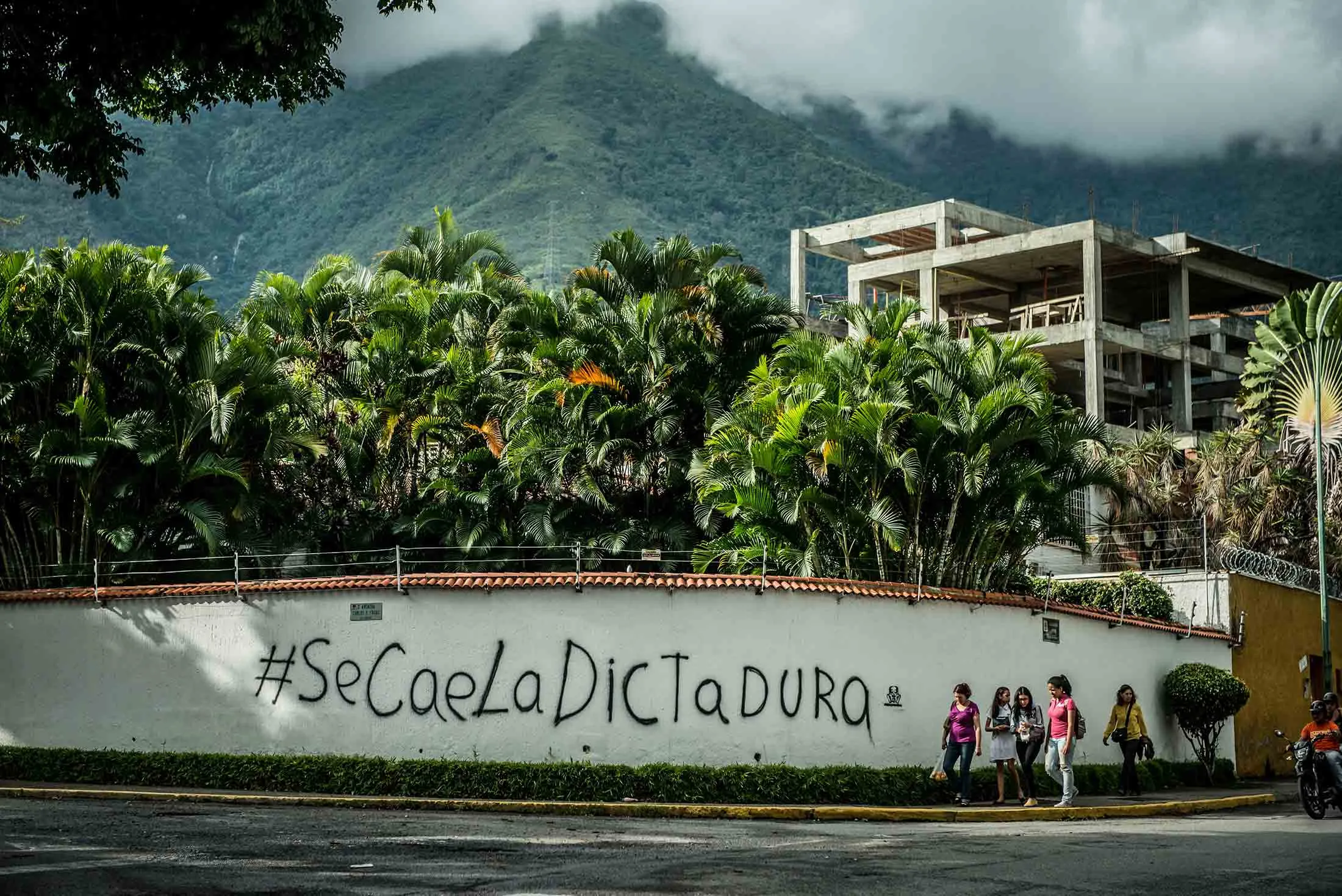 在查卡奥的反政府涂鸦,上面有一个西班牙语的标签:“独裁政权垮台。”摄影师:梅里迪斯·科赫特/彭博社从远处看,委内瑞拉的首都似乎昼夜燃烧。针对威权总统尼古拉斯·马杜罗的抗议活动已经持续了超过100天,造成了大量生命的损失,经济崩溃,民众饥饿。本月,国家面临可能削弱民主的制宪大会、总罢工和新的经济制裁的前景。但在黑暗降临后,一个精英阶层涌现出来,填满了查卡奥的酒吧、脱衣舞俱乐部和大理石地面的购物中心。