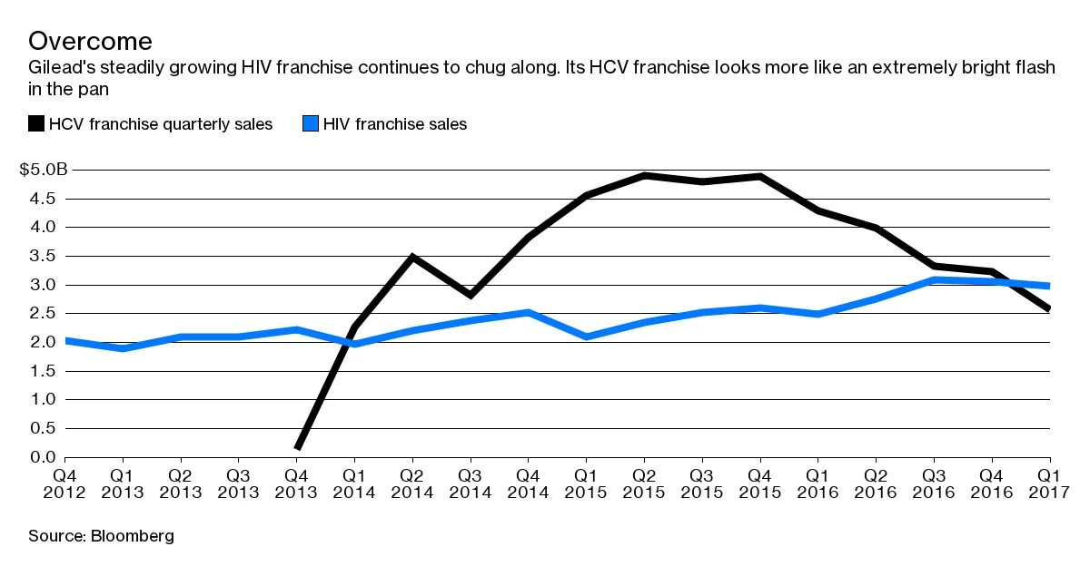 吉利德科学公司是这个分歧两侧的案例研究。该公司拥有一个长期存在的HIV药物系列,包括一系列需要服用多年的多药物方案。这已经是一个可靠增长的数十亿美元业务,持续了十多年。